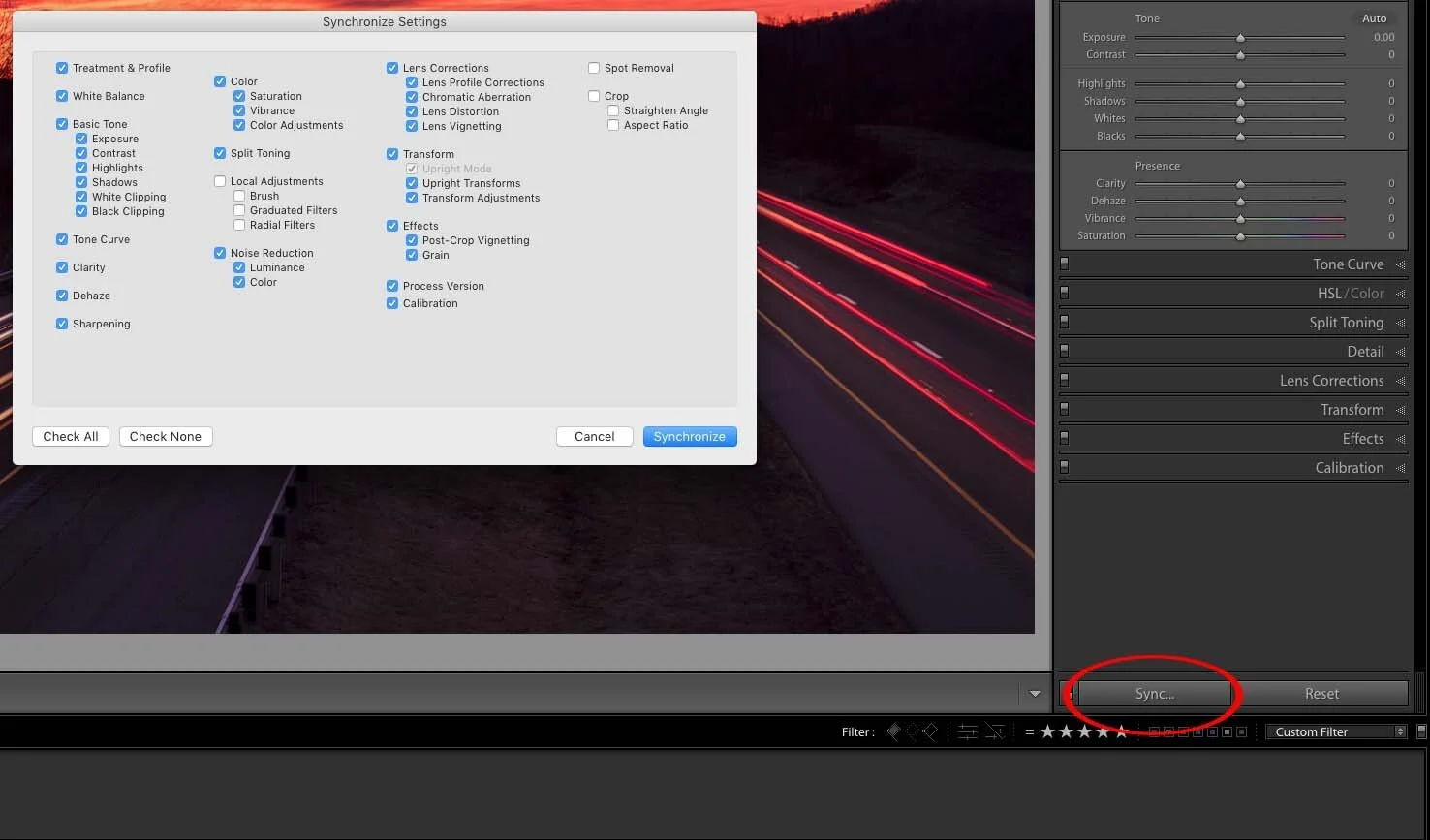 Tip: Settings such as Local Adjustments, Spot Removal and Crop are best to leave unchecked while syncing settings. Unless the subject does not move in any of the frames, such as product photography, then these adjustments will not sync properly. Best to do these adjustments with each photo.